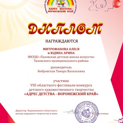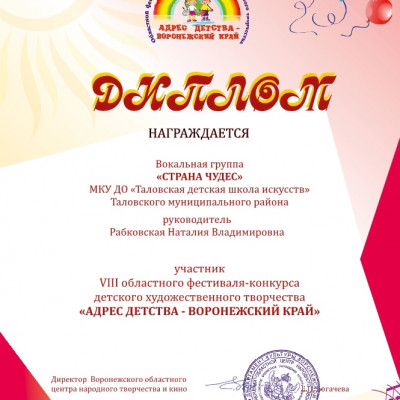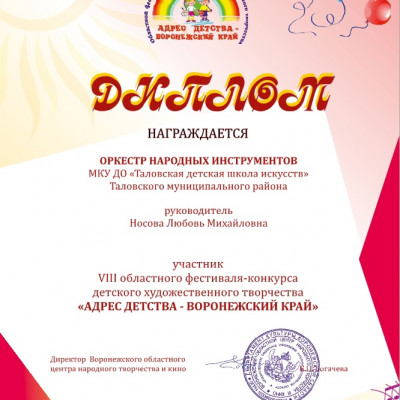 В среду, 20 марта, в городе Новохопёрске прошёл второй этап VIII областного фестиваля-конкурса детского художественного творчества «Адрес детства – Воронежский край». В составе делегации Таловского района выступили и наши ученики – вокальная группа «Страна чудес» под руководством Натальи Владимировны Р. и оркестр русских народных инструментов учащихся Таловской ДШИ под руководством Любови Михайловны Н. Все участники были отмечены дипломами Воронежского областного центра народного творчества и кино.