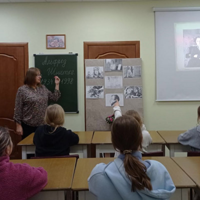 Для учащихся старших классов отделений «Сольное пение. Эстрадный вокал», «Хоровое пение» преподавателя Ольги Вячеславовны А. прошло мероприятие «Музыка и кино», посвященное 90-летию композитора Альфреда Шнитке.