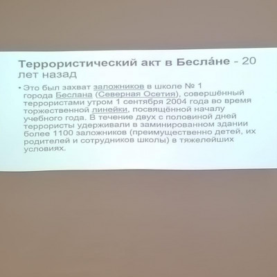 Ученикам напомнили, что включает в себя понятие «терроризм», в чем его опасность для всего человечества. Педагоги вместе с детьми вспомнили новейшую историю России и привели примеры террористических актов, еще раз рассмотрели чрезвычайную опасность этих событий.