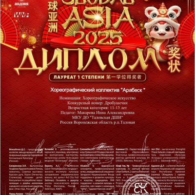 Хореографический коллектив «Арабеск» Таловской ДШИ прошёл отборочный тур Международного русско-китайского онлайн-конкурса «GLOBAL ASIA 2025». Все танцы, представленные на конкурс, «Топотушки», «Дробушечки», «Казаки-казаченьки», «Чибатуха», награждены дипломами Лауреатов 1 степени. Жюри конкурса также отметило Благодарственным письмом многолетнюю работу и педагогическое мастерство Инны Александровны М. – руководителя детского танцевального коллектива. «Арабеск» получил статусы «официального делегата» и «участника» Русско-Китайского международного проекта «GLOBAL ASIA».