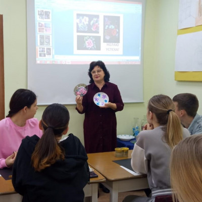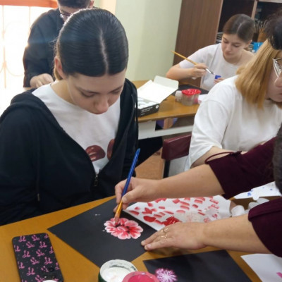 В среду, 23 апреля, педагог детской школы искусств Алла Ивановна Петриёва провела для учеников 10 класса Каменностепной СОШ мастер-класс по теме «Роспись в технике One stroke (один мазок)». Подростки после объяснения педагога, самостоятельно создали эскизы для своих будущих работ. Они выполнили их на чёрном картоне гуашью плоскими кистями. Перед мастер-классом были выставлены работы Аллы Ивановны П., выполненные в данной технике.