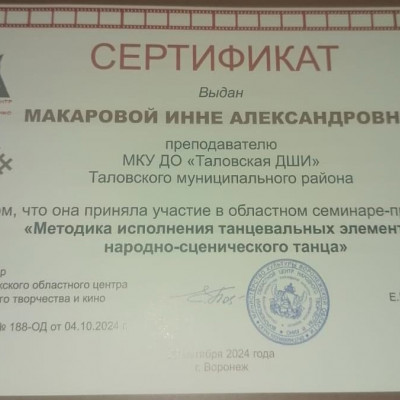 Преподаватель хореографического отделения Таловской ДШИ Инна Александровна М. в составе делегации района поучаствовала в областном семинаре-практикуме руководителей любительских хореографических коллективов Воронежской области. Проблема семинара - методика исполнения элементов народно-сценического танца. Участники семинара узнали много полезного для использования в практической работе. Педагоги-хореографы области работали в районном доме культуры Каменского муниципального района. Подготовил и провел семинар Воронежский областной центр народного творчества и кино.